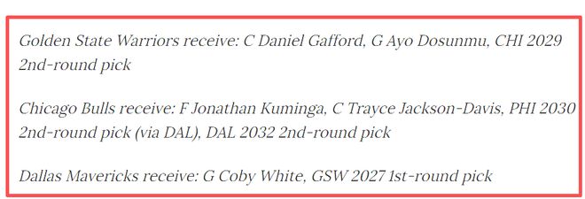 三队各取所需,勇士得到加福德这位高大的中锋,弥补了球队多年来的篮板短板,多苏穆的防守与组织能力也能丰富球队的后场轮换;公牛用即将到期的科比·怀特换来更年轻、更具活力的库明加,与乔什·吉迪组成未来双核;独行侠则通过参与交易得到心仪已久的科比·怀特,补强后卫深度,同时获得勇士的首轮选秀权,优化资产结构。随着1月15日库明加交易资格的到来,这笔交易的推进速度将进一步加快。