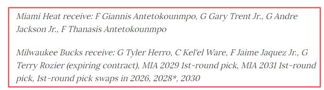 交易方案:热火获得——字母哥、加里·特伦特二世、安德烈·杰克逊二世、塔纳西斯·阿德托昆博;密尔沃基雄鹿获得——泰勒·希罗、凯尔·韦尔、海梅·哈克斯二世、特里·罗齐尔(合同到期)、2029年首轮选秀权、2031年首轮选秀权、2026年/2028年/2030年首轮选秀权交换(若2027年选秀权未转让,可替换为2027年乐透权交换权)。