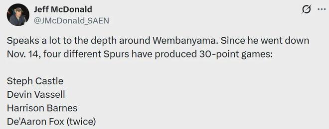 据统计,文班亚马11月15日受伤休战以来,马刺阵中已经有4人单场砍下30+得分,分别是卡斯尔、瓦塞尔、哈里森·巴恩斯和达龙·福克斯(2次)。