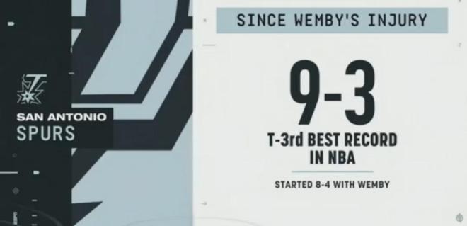 在文班亚马缺席之后,马刺拿到了9胜3负的战绩,排在全联盟同期第3。