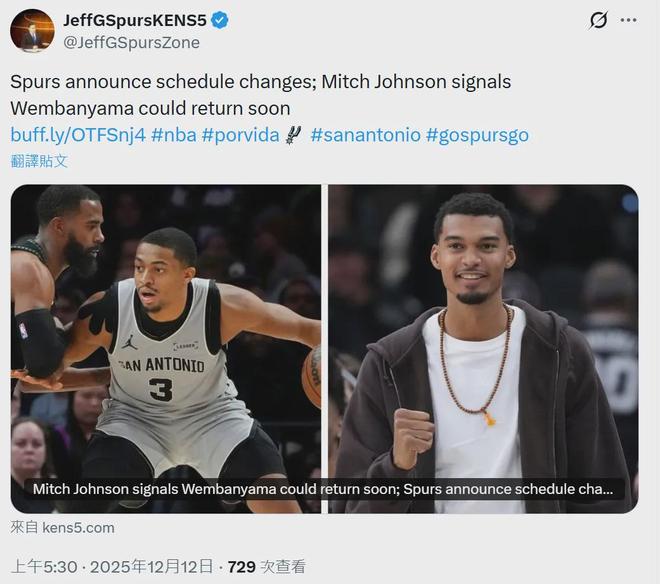 “文班亚马在NBA杯赛的半决赛里复出可能性很大,他今天状态很好,早上进行了非常高强度的训练,我们需要看看他明天的反应。”马刺主帅米奇最后这么通报全联盟。