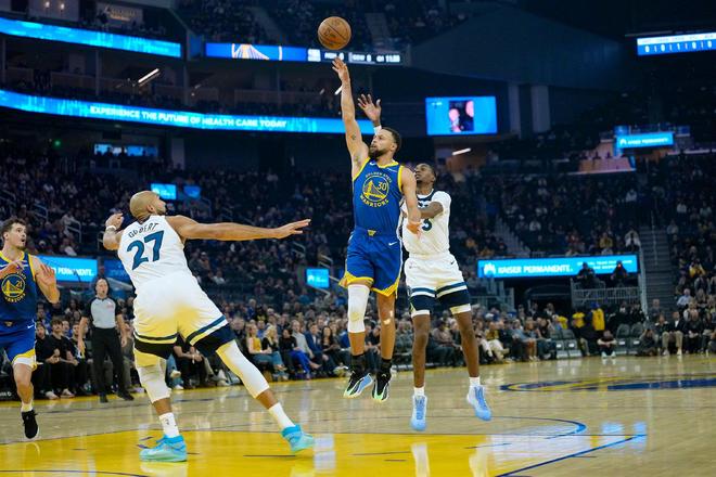 毕竟这家伙,自带复出Buff。值得一提的是,面对今天的对手森林狼,库里穿上了对面核心爱德华兹的球鞋。但问题是,今天爱德华兹休战了。甚至,爱德华兹的替补海兰德在首节比赛中也遭遇膝盖挫伤退赛。所以一时间,场上的的对阵变得非常奇怪。森林狼那边全是大个子,锋线群储备异常凶猛。勇士队则全是小个子,极致的五小对阵极致的五大。不过,虽然身高有差距,但勇士队有库里啊!比赛一开始,就是库里先声夺人帮助勇士队取分,手感来得很快。很快,库里的三分也来了,个人连得8分。库里滚烫的手感,让森林狼不得不火速调整一下防守策略。